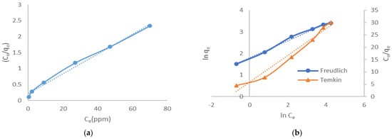 Isotherm plots for the adsorption of CV using LCF (C0 = 25, 50, 75, and 100 ppm; m = 0.025 g; contact time = 5 min): (a) Langmuir and (b) Freundlich and Temkin isotherm models.