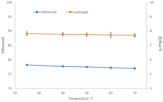 The effect of temperature on the CV dye sorption on LCF was studied at various temperatures: 25, 40, 50, 60, and 70 °C. As shown in Figure 11, the adsorption capacity of CV decreases from 79 to 70% when the temperature increase from 25 to 70 °C, indicating an exothermic adsorption process. This deficiency could be due to the cracking of some of the formed bonds between adsorbent and adsorbate after raising the temperature. These results specify that it is preferable to operate this adsorption process at room temperature, which is economical and positively affects the adsorption process. This behavior is consistent with another study investigated by Al-Shehri et al. [].
