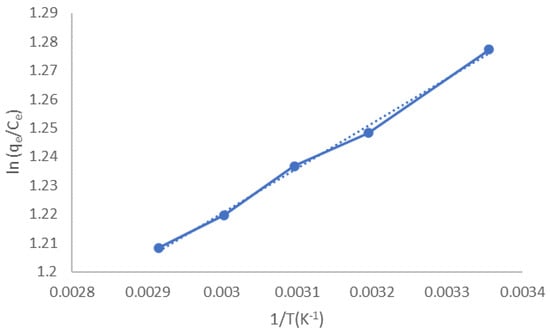 To evaluate the thermodynamic parameters, the ln (qe/Ce) was plotted against 1/T (K–1) for adsorption at different temperatures that range from 25 to 70 °C. The initial CV concentration (10 ppm) was constant with 0.025 g adsorbent, 5 min contact time, and pH 7. The ΔH0 and ΔS0 were determined from the trend line slope and intercept (Figure 12). Conversely, ΔG0 was calculated from the values of ΔH0 and ΔS0 using Equations (8) and (9). The thermodynamic obtained parameters are listed in Table 4. It was found that ΔH0 was –1.3 KJ/mol for CV adsorption by LCF with a negative value, which agrees well with the outcome of Figure 11. Moreover, the ΔH equals –1.3 kJ/mol, smaller than 40 KJ/mol, implying that CV was physically adsorbed on the adsorbent active sites []. As listed in Table 4, the adsorption process is spontaneous at all studied temperatures, as the value of ΔG0 is negative. The positive sign of ΔS0 means that the system has a good affinity of CV towards magnetic LCF adsorbent [].