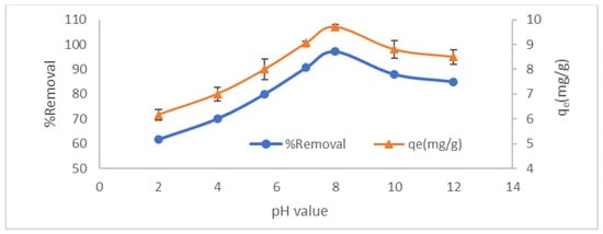 The pH of the solution is the most vital factor that controls the CV adsorption onto LCF particles. This importance is due to many reasons, e.g., the adsorption of H+, OH−, and other ions can affect the adsorption media pH. Moreover, the solution pH directly affects the CV degree of ionization, the dissociation degree of the functional groups on the LCF active sites, and the LCF surface charge []. Batch adsorption experiments were performed to investigate the influence of the solution pH on the CV adsorption onto the LCF in the solution pH range from 2 to 12. As shown in Figure 13, at acidic media, the solution pH leads to decreased CV removal as a result of the competition between the generated H+ and the CV cations ions []. However, the maximum CV removal (97%) occurs at solution pH 8. It is reported that the low pKa of the CV (0.8) and (5.3) leads to complete and facile ionization of this dye at almost all pH values and is present in the solution as cations [,]. Therefore, adjusting the pH solution to be higher than the pka value is favorable in dye removal. Increasing the pH from 2 to 8 increases the electrostatic interaction between the LCF negative charges and the CV dye ions []. Further, an increase in the solution pH up to 12 leads to a decrease in the CV removal to 85%, which may be owing to repulsion forces between OH- groups generated in the solution due to the high solution pH and the anionic function groups on the LCF surface. Cheruiyot et al. achieved optimum dye removal at pH = 8 with the same behavior of dye by using coffee husk [].