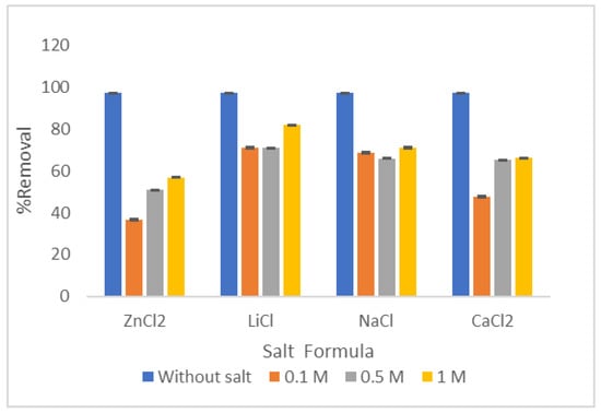 On the other hand, the divalent salts (ZnCl2 and CaCl2) with the hydrous radius of Zn+2 = 4.26 Å and Ca+2 = 4.1 Å followed the same trend as monovalent salts, but with fiercer competition. Figure 15 shows that the % removal decreased from 92 to 56.8 and 66% by dissolving 1 M of Zn and Ca salts in the dye solutions, respectively. The adsorption capacity increases for calcium and zinc salts by decreasing the salt concentration in the dye solution. Consequently, none of the previous salts achieved a higher removal percentage than the zero molar or even close. This behavior is due to the increase in the positive ionic charge, which accelerates the repulsion force with the cationic dye resulting in aggressive competition to occupy the active sites.