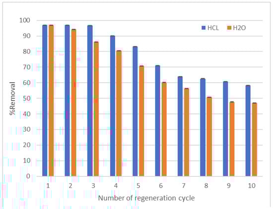 One of the most important economic aspects that is desirable to designate a material is the possibility of reusing it several times. Compared with several eluents, many studies have found that reusing acids as desorbing agents for removing cationic dye is the most effective. As shown in Figure 16, using HCl has a great positive effect on the resorption process, as LCF is able to reuse the five cycles with removal efficiency 86%, and this reaches 60% after 10 cycles. This trend could be attributed to the fact that the process of reabsorption takes place effectively where the hydrogen ions are contained, competing with the dye molecules and extracting them from the adsorbent surface and replacing it, which leads to the possibility of reusing the material many times. On the other hand, the use of slightly heated water resulted in less effectiveness than that previously studied, but it is resendable as well, as when the adsorption reached 80% after the 4th cycle, then this percentage declined to 47% at the 10th cycle. Perhaps the efficiency of the reuse process is due to the weak physical bond (van der Waals bond) formed between the adsorbent and adsorbate, which is easy to break. From the above, the LCF can be considered an economically effective magnetic adsorbent and can be applied to the industrial field, and it is recommended to be used in continuous systems with residual time 5 min to maximize the utilization of its properties. This indicates an important feature that allows it to be used in the industrial field effectively.