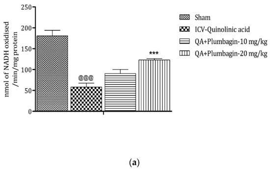 Elevated level of NO leads to the generation of free radicals followed by neurodegeneration. The ICV QA-induced group showed a significant (@@@ p < 0.001) increase in the concentration of NO in comparison with the sham group. No substantial effect was observed by the low dose of plumbagin of 10 mg/kg. However, a high dose of plumbagin remarkably (p < 0.05) lowered the NO concentration when contrasted with the ICV QA-exposed group (Figure 8).