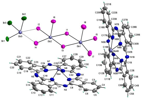 The obtained antimony-phthalocyanine complex crystallizes in the centrosymmetric space group of the triclinic system. Refinement of the structure of the title compound (1) shows that both ionic parts of the crystal building blocks, i.e., in (SbPc)+ as well as in the [(Sb2I8)(SbBr3)]2−, contain the antimony in the same oxidation state (Sb3+). The molecular structure of the asymmetric unit is illustrated in Figure 1.