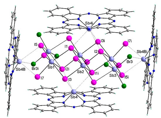 The anion of the complex consists of four distorted SbI6 octahedra lined together by μ2 and μ3 bridging I atoms into a (Sb4I16)4− anion that weakly interacts with two SbBr3 molecules forming the centrosymmetric (Sb6I16Br6)4− counterion complex (Figure 2). Generally, the Sb–I bond lengths fall into two groups, namely shorter Sb–I bonds with terminal I atoms and longer Sb–I bonds involving the bridging I atoms (Table 2). However, in the (Sb6I16Br6)4− anion, two different bridging I atoms exist. Atoms I1 and I2 bridge three Sb atoms, while atoms I3, I4, and I5 bridge only two Sb atoms. The Sb–Br bonds with distances ranging from 2.5659(14) to 2.6888(12) Å are shorter, as expected, than the Sb–I bonds (Table 2) and correlate with their covalent or ionic radii of I and Br [87,88]. Looking in more detail at the differences between the Sb–I and Sb–Br bond lengths and at the coordination geometry around atoms Sb1, Sb2, and Sb3, it is clear the Sb1 and Sb2 atoms are coordinated to the six I atoms through forces of different strength, whereas Sb3 coordinates to three Br and the three I atoms. Atom Sb1 links two I atoms with relatively short Sb–I bonds, two I atoms with intermediate Sb–I values, and two I atoms with relatively long Sb–I bonds, the longest being the Sb1i–I1 bond 3.4281(12) Å (Table 2).