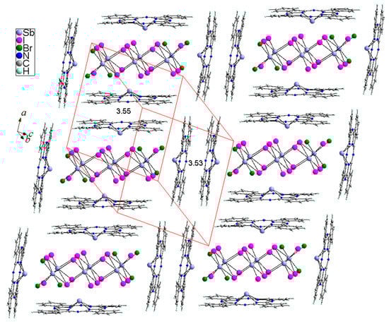 Each of the two independent (SbPc)+ cations interact with the [Sb6I16Br6]4− counterion in a slightly different manner. The Sb4 of (SbPc)+ interacts with three iodine atoms (I1, I2 and I3) while the Sb4B of (SbPc)+ interacts with two iodines (I5 and I7) and one bromine (Br3) with the contacts Sb–I and Sb–Br being much longer than the sum of the covalent radii of Sb (1.39 Å), I (1.40 Å) and Br (1.20 Å) [87] but shorter than the sum of the van der Waals radii Sb and I of ~4.3 Å or Sb and Br of ~4.1 Å [88]. The average Sb–I distance of 3.578 Å and the Sb–Br distance of 3.5941(18) Å between the Sb of (SbPc)+ units and I or Br atoms of [Sb6I16Br6]4− complex anion point that the interaction between (SbPc)+ units and [Sb6I16Br6]4− anion is intermediate between ionic and covalent. The centrosymmetric [(SbPc)4(Sb6I16Br6)] aggregates related by translation in crystal form a stacking structure along the [100] and [111] directions with back-to-back oriented (SbPc)+ pairs (Figure 4).
