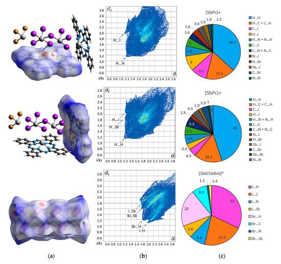 The HS of the [Sb6I16Br6]4− unit shows small light-red areas resulting from the interaction of I–Sb and Br–Sb with the surrounding units (SbPc)+ with contributions of 6.8% and 1.4% in the HS. However, the main contribution to the HS results from the interactions of I–H and Br–H, which account for more than 50% of the HS area. The contribution in area of the HS of the (Sb4I16Br6)4− anion resulting from the I–C, Br–C, I–N, and Br–N interactions with a total share is about 40%. The deconvolution of the 2D-fingerprint plot illustrating the respective interactions for both independent (SbPc)+ units and for (Sb4I16Br6)4− counterion is shown in Figure S2 (in Supplementary Materials).