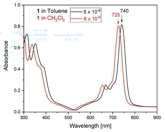To characterize the optical properties of the obtained antimony(III) phthalocyanine complex, [(SbPc)4(Sb6I16Br6)], the absorption UV–Vis electronic spectra were made in CH2Cl2 and toluene solutions (Figure 6). The ground state electronic absorption spectra of [(SbPc)4(Sb6I16Br6)] in CH2Cl2 and in toluene solutions show relatively sharp Q bands typical of unaggregated MPc complexes, as has been reported before for other antimony(III)–phthalocyanine derivatives [94,95]. The Q band in the spectrum of the [(SbPc)4(Sb6I16Br6)] complex in both solutions is broadened, and the half-width of this band is almost twice as wide as compared to the spectra of normal/flat M(II) Pc complexes [96,97,98], since the Sb(III) is larger than the equilibrium cavity size of the ring and cannot be accommodated without ring expansion; thus, the metal protrudes out of the cavity, forming a non-planar Sb(III) phthalocyanine complex. Thus, the symmetry of the (SbPc)+ complex unit in solution becomes D4v symmetry that is lower than D4h as for normal/planar MPc complexes in solutions [99]. Lowering of the symmetry of the (SbPc)+ allows for some so far forbidden transitions, and consequently, spectral splitting as well as a broadening is observed. The Q-band, an electronic transition from HOMO to LUMO of the phthalocyanine ligand in character, in the spectrum of the SbPc complex 1 in the CH2Cl2 solution is observed at ~725 nm (logε = 5.33), and the Q band in the spectrum in toluene solution is red shifted to ~740 nm (logε = 5.35), whereas for normal, planar and with D4h symmetry of metal(II) phthalocyanines, the Q band is observed at almost the same wavelength (~670 nm) [100].