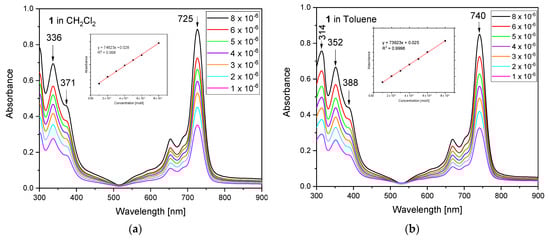 The aggregation behavior of the investigated antimony(III)–phthalocyanine complex (1), [(SbPc)4(Sb6I16Br6)], was examined by varying the concentrations in both used solvents within the limits of the Beer–Lambert’s law. The aggregation of phthalocyanines, especially the planar metallophthalocyanines occurs in solution through a coplanar association that makes the conversion of a monomer to higher order complexes. However, this antimony(III) phthalocyanine complex, due to the non-planarity of the (SbPc)+ unit and the partially ionic character of the complex, is better soluble in the most organic common solvents. The aggregation behavior of the [(SbPc)4(Sb6I16Br6)] complex was investigated in CH2Cl2 and toluene solutions with concentrations between 8 × 10−6 mol/L and 10−6 mol/L. Both solvents are characterized by a non-zero dipole moment, μ = 1.60 D and μ = 0.36 D for CH2Cl2 and toluene, respectively [101]. The antimony(III) phthalocyanine complex (1) has minimum aggregation in both solvents, as illustrated in Figure 7. With an increase in concentration, the intensity of absorption of the Q-band increased linearly, with no new band and wavelength shifts observed, which clearly evidenced that the aggregate species was not observed.