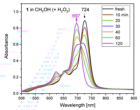 Spectral changes during the oxidation by H2O2 of 5 × 10−6 mol [(SbPc)4(Sb6I16Br6)] in methanol. The Q bands at 724 nm and 697 nm are characteristic for the SbIII and for SbV phthalocyanines, respectively.