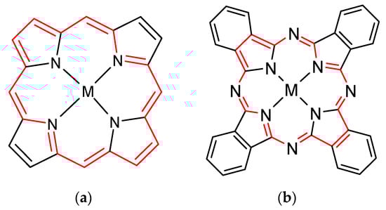 Metalloporphyrins (a) and metallophthalocyanines (b) showing the 18π-electron tetrapyrrole macrocycle (in red). For metal-free porphyrin or metal-free phthalocyanine, M is two hydrogens.