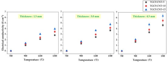 The effect of various carbonization temperatures, the thickness of TGCF/CNT, and the CNT content on the electrical conductivity are shown in Figure 1. First, all samples carbonized at 700 °C demonstrated an electrical conductivity of approximately 0 S cm−1, which was unrelated to the thickness of the TGCF/CNT carbon papers and the CNT contents. At a carbonization temperature of 900 °C, the electrical conductivity was detected in the samples. In general, the electrical conductivity increased with the increase in the carbonization temperature, CNT content, and paper thickness. For instance, the electrical conductivity of TGCF/CNT carbon papers with a thickness of approximately 1.5 mm reached 3.97 S m−1 as the CNT content and carbonization temperature increased. Similarly, TGCF/CNT carbon papers with a thickness of approximately 3 mm exhibited a value of ~4.78 S m−1. Finally, the TGCF/CNT-15 carbon paper with a thickness of approximately 4.5 mm carbonized at 1300 °C reached a value of ~6.35 S cm−1. This is because the introduction of more CNTs with a high electrical conductivity (~10 S m−1) decreased the distance between CNTs and led to thicker TGCF/CNT carbon papers with a high CNT loading, thereby increasing the electrical conductivity. Moreover, the increase in the carbonization temperature decreased the distance between the carbon clusters, facilitating electron hopping and the quasi-percolation of the conducting area [32]. These electrical conductivity variations were reflected in the EMI SE results.
