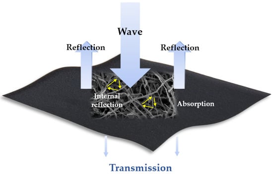 where SER, SEA, and SEM are the reflection, absorption, and multiple reflection values (in decibels (dB)), respectively. Figure 2 shows the EMI SE mechanism for the TGCF/CNT carbon papers [37,38].