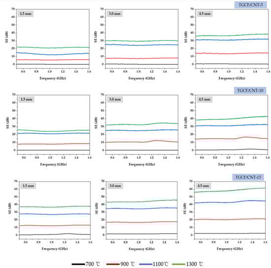 Figure 3 shows the EMI SE of the TGCF/CNT carbon papers according to the respective conditions. From Figure 3, the EMI SE of TGCF/CNT carbon papers was affected by the electrical conductivity, which varies according to the carbonization temperatures, thickness, and CNT content of the TGCF/CNT papers. In the case of the TGCF/CNT carbon papers carbonized at 700 °C, the EMI SE was 0 dB because their electrical conductivity was 0 S m−1. At a carbonization temperature of 900 °C, EMI SE began to be observed owing to the presence of the electrical conductivity in the carbon papers. In the case of TGCF/CNT carbon papers with a thickness of 1.5 mm that were carbonized at 900 °C, with the increase in the CNT content, the EMI SE increased from 5 dB to 13 dB at 1.6 GHz. When the thickness of the TGCF/CNT carbon paper carbonized at 900 °C was increased to 4.5 mm, the EMI SE reached approximately ~20 dB at 1.6 GHz. So, for the TGCF/CNT carbon papers carbonized at 1100 °C, with an increase in the CNT content and thickness, their EMI SE elevated to approximately 42 dB at 1.6 GHz. Finally, TGCF/CNT-15 carbon papers with a thickness of 4.5 mm showed the highest EMI SE value of approximately 62 dB at 1.6 GHz, while exhibiting an electrical conductivity of 6.35 S cm−1.