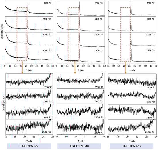 X-ray diffraction profiles of TGCF/CNT carbon papers for various carbonization temperatures and CNT contents.