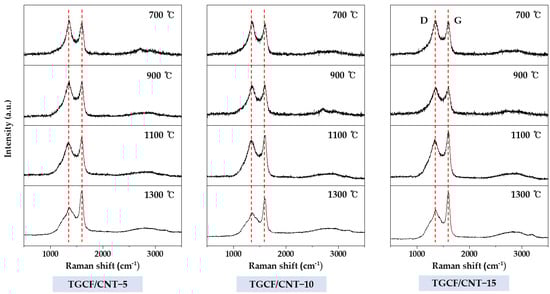 Raman spectra of TGCF/CNT carbon papers obtained according to various carbonization temperatures and CNT contents.