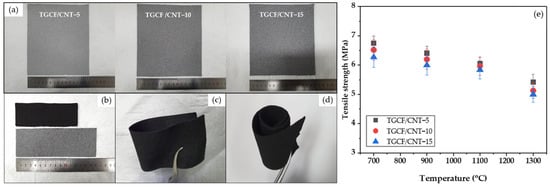 Figure 6a–d shows photographs of TGCF/CNT papers with different CNT ratios. As shown in Figure 6a, the TGCF/CNT paper became darker gray with an increase in the CNT content. After carbonization, the TGCF/CNT carbon paper displayed an apparent size reduction, but maintained its shape. In addition, the TGCF/CNT carbon papers could be flexibly bent and wound without breaking. Figure 6e shows that the tensile strengths of samples decreased slightly with the increase of carbonization temperature for every CNT content; even at the lowest temperature and CNT content, the error bar did not extend appreciably above 7 MPa.