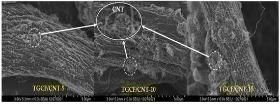 The surface SEM images of the TGCF/CNT carbon papers are shown in Figure 7. CNTs are more attached and aggregated on the surface of the cellulose fibers. Therefore, the SEM results indicated a higher amount of CNT attachment on the fiber improved the electrical conductivity and EMI SE.