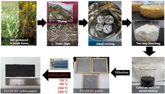 As shown in Figure 8, to obtain cellulose fibers from tall goldenrod plants, first, the flowers and leaves of dried tall goldenrods were disposed and parts of their trunk were chipped by approximately 1 mm. The chips were autoclaved for 5 h at 121 °C in 15 wt% NaOH solution and then bleached twice using 10 wt% H2O2 solution and a 5 wt% H2O2 stabilizer. The bleached tall goldenrod pulps were used as TGCFs. The TGCFs were mixed with CNTs in water at weight percentage ratios (95:5, 90:10, and 85:15), and 1 wt% polyacrylamide (PAM) solution as a binder was added. Finally, through the filtration process of the TGCF/CNT solution, the respective papers in accordance with the weight percentage ratios were prepared. The TGCF/CNT papers were carbonized at 700, 900, 1100, and 1300 °C. The TGCF/CNT paper samples were labeled as TGCF/CNT-5, TGCF/CNT-10, and TGCF/CNT-15 according to the CNT content.