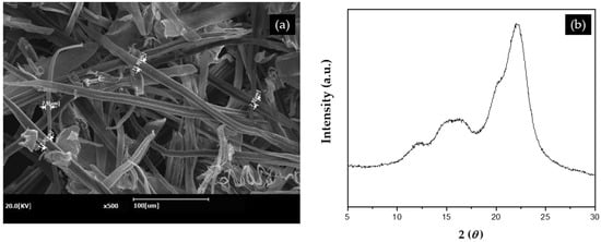 The chemical compositions of tall goldenrods and TGCF are shown in Table 3. The cellulose, hemicellulose, and lignin contents were obtained by the Technical Association of the Pulp and Paper Industry (TAPPI) process and the silica ash was settled by the thermogravimetric analysis (TGA, SDT 650, TA, New Castle, DE, USA). The SEM image in Figure 9a shows that TGCFs have fiber diameters in the range of approximately 8~13 μm. The XRD profile in Figure 9b shows the diffraction peaks at 2θ = 16° and 22.6°, assigned to the (110) and (200) planes, respectively; they are associated with cellulose I [42,43].