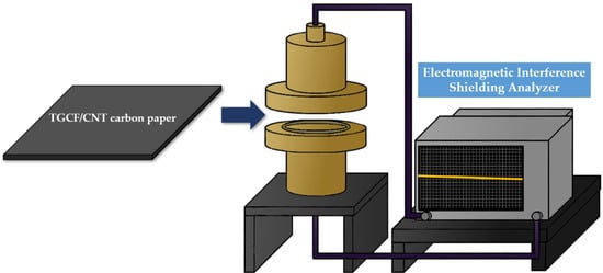 The EMI SE analyzer (KEYSIGHT, E5080A Vector Network Analyzer, Santa Rosa, CA, USA) was scanned in the frequency range of 0.5 to 1.6 GHz. Figure 10 shows the EMI shielding analyzer apparatus. This network analyzer can determine the effectiveness of the absorption, transmission, and reflection of TGCF/CNT carbon papers.