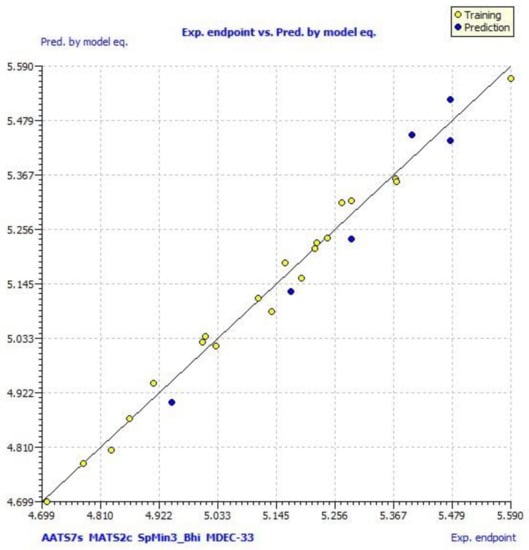 RMSE tr = 0.0244 MAE tr = 0.0198 RSS tr = 0.0119 CCC tr = 0.9937s = 0.0281F = 296.9651 Q2loo = 0.9789 RMSE cv = 0.0316 MAE cv 0.0260 PRESS cv = 0.0200 CCC cv = 0.9894 Q2LMO = 0.9738 R2Yscr = 0.2095 Q2Yscr = −0.4288 RMSE ext = 0.0527 MAE ext = 0.0512 PRESS ext = 0.0167 R2ext = 0.9665 Q2-F1 = 0.9586 Q2-F2 = 0.9220 Q2-F3 = 0.9416CCC ext: 0.9677 (Equation (3)).