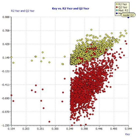 Y-scramble plot (plot of Kxy vs. R2 and Q2 LOO from Y-scrambling procedure).