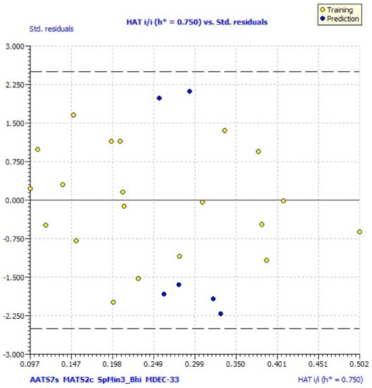 IC1 parameter was newly included in model 4 and it had a negative contribution to the activity. The applicability domain of the model was explained by William’s plot, standardized residuals versus leverage values shown in Figure 4, and it illustrates the prediction and expression. William’s plot indicated that all the molecules are located in the applicability domain of the model with leverage values lower than the warning h* of 0.750.