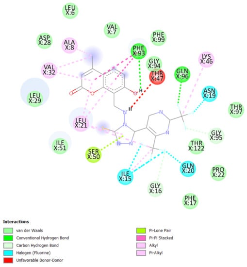A molecular docking study was performed in order to study possible interactions between the protein complex and the ligand for the designed compounds. In the present manuscript, we attempted to study the interactions of novel pyrimidine-coumarin-triazole hybrids with DHFR. In order to study the binding efficacy of all the designed compounds a–l, molecular docking studies were performed in the binding pockets of S. aureus dihydrofolate reductase [PDB ID:3SRQ]. All the designed compounds exhibited better binding scores ranging from −6.9 to −9.3 kcal/mol. Binding energies of compounds which target colchicine binding site (PDB ID 1SA0) and vinblastine binding site of tubulin (PDB ID 5J2T) and Staphylococcus aureus dihydrofolate reductase [PDB ID: 3SRQ] are presented in Table 6. Docking interactions of the best active compounds are shown in Figure 5, Figure 6, Figure 7, Figure 8 and Figure 9 whereas Figure 10 and Figure 11 represents the binding interactions of designed compounds b and h on the vinblastine binding site of tubulin and DHFR of human proteins.
