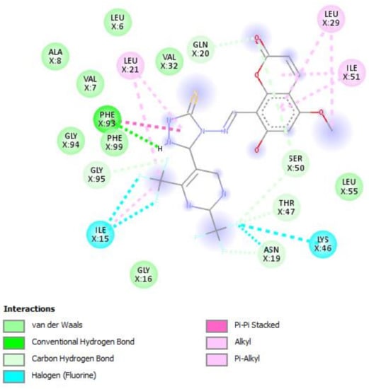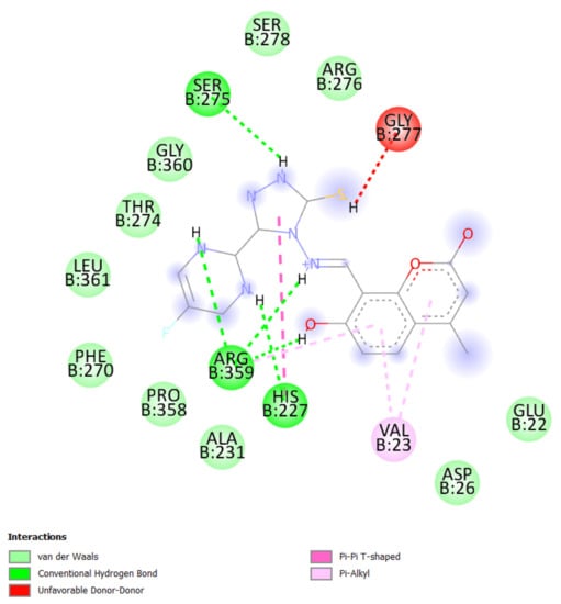 Conventional hydrogen bonds are formed between designed compound k and Leu-248, Gly-179, Asn-143 and Gln-11 groups of enzymes at distances of 5.40, 4.47, 4.47 and 4.54 angstroms, respectively. Three halogen bonds were formed between the trifluoromethyl group of compounds and Ala-247 at a distance of 5.43 Å. Pi-sigma bonds and pi-pi stacked bonds were formed between the pyrone nuclei of Cys-12 and Gln-11 at distances of 4.80 and 6.95 Å, respectively. Pi anion bonds were formed 6.95 Å away from the triazole fragments of nuclei with Glu-254 of enzymes (Figure 8).