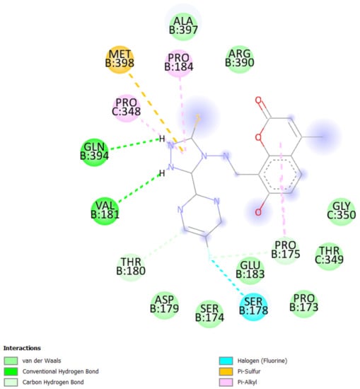 The binding affinity of novel compounds towards vinblastine binding sites of tubulin were in the range of −9.2 to −6. The designed compound b showed a binding energy of −9.2. The designed compound b binds with the target by forming two conventional hydrogen bonds with Gln-394 and Val-181 at distances of 4.42 and 2.56 Å, respectively. Two pi-alkyl bonds were formed between the coumarin nucleus and Pro-175 of the target at 5.37 Å. (Figure 9). On comparing the binding affinities between the colchicine binding site and vinblastine binding site of tubulin, it was found that compound k with 4-cyclopropyl-2-(trifluoromethyl)pyrimidinyl substitution showed binding affinity towards the colchicine binding site, while compound b with 5-fluoropyrimidinyl substitution showed binding affinity towards the vinblastine binding site of tubulin. The interactions of the compounds g, h, and i with the DHFR for protein are presented in Figure 5, Figure 6 and Figure 7.