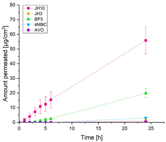 For the in vitro skin permeation experiments, test compounds and commercial UV filters were incorporated into a formulation. The obtained results showed that the amount of JH10 in the receptor fluid (RF) was detectable (1 µg/cm2) after the first hour of exposure. We then observed a constant increase in the portion of JH10 through the next hours. JH3 was undetectable in the RF in the first six hours. After 24 h exposure, the detectable amount of this compound was about 28-fold lower than that of JH10. Among the applied commercial UV filters after 24 h, BP3 demonstrated the highest absorption rate (20 µg/cm2), whereas avobenzone (AVO) the lowest (3 µg/cm2) absorption rate (Figure 1). The amounts of BP3 in the RF were clearly detectable after the third hour of the epidermis exposure followed by a steady increase over the next 21 h. Similar to JH3, the presence of the commercial UV filter 4MBC was detected only after 24 h exposure (Figure 1).