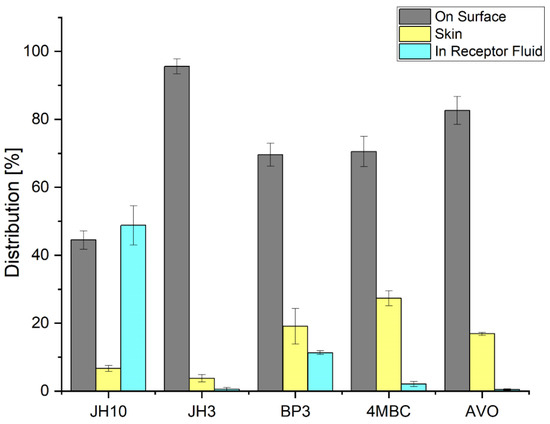 Figure 2 shows the distribution of test compounds and commercial UV filters after permeation through the EpiskinTM following 24 h exposure to 10 mg/cm2 (finite dose) of the studied compounds. According to the results obtained, JH10 showed the highest cumulative absorption with 48% of the applied dose detected in the RF. By contrast, the absorbed amount of JH3 was 1%. In the case of the studied commercial UV filters, absorbed fractions of 12% and 3% were observed for BP3 and 4MBC, respectively. The absorbed amount of AVO was very similar to JH3 (i.e., about 1%). The epidermis analysis resulted in recovery of 28, 18, 16, 7, and 3% of the applied dose of 4MBC, BP3, AVO, JH10, and JH3, respectively. The amount of test compounds remaining on the surface of the EpiskinTM reached 95% for JH3 and 45% for JH10. For the commercial UV filters, the values were in the range of 70–83% and were the highest for AVO. The amount of BP3 in this compartment was comparable with 4MBC.