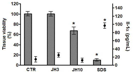 When new active cosmetic ingredients are developed, the skin irritation potential is evaluated to identify substances capable of inducing adverse skin reactions [49]. It is noteworthy that acute skin irritation is the most common local toxic effect observed after contact with cosmetic ingredients and is characterized by reversible damage of the skin [50]. In the present study, two parameters were determined in the assay based on the EpiskinTM model, such as cell viability and the amount of cytokine Il-1α released into the culture media. The obtained results identified that both JH3 and JH10 can be classified as non-irritants.