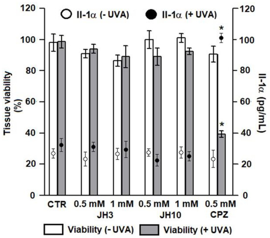 The study demonstrated that without UVA exposure, no changes in tissue viability were noticed after test compounds JH3 and JH10 were applied onto EpiskinTM with the two concentrations (i.e., 0.5 and 1 mM) tested. There was also no significant difference in the viability of irradiated epidermis treated with the same test concentrations (Figure 4). Measurement of the Il-1α confirmed these results, as its level reached a maximal value of 31 pg/mL and corresponded to the release observed in non-irradiated tissue (Figure 4). These results demonstrated the absence of phototoxic potential for test compounds in our test conditions. Chlorpromazine (CPZ), which served as a positive control, in the tested concentration of 0.5 mM after UVA exposure significantly decreased tissue viability to about 40% as compared to non-irradiated epidermis. Moreover, the Il-1α release was correlated with cell mortality after CPZ treatment and UVA exposure (Figure 4).
