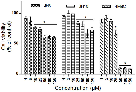 In the MTT test, a reduction in CHO-K1 cell viability was observed following a 24 h treatment at doses of 10 to 150 µM of JH3, 25 to 150 µM of JH10 and 4MBC in comparison with the negative control group (Figure 5).