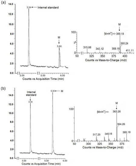 Formation of main metabolites (M) from JH3 (a) and JH10 (b) when test compounds were incubated with human liver microsomes (HLMs) without NADPH-regenerating system. Chromatograms and ion fragmentation (MS/MS) spectra for main metabolites are shown.