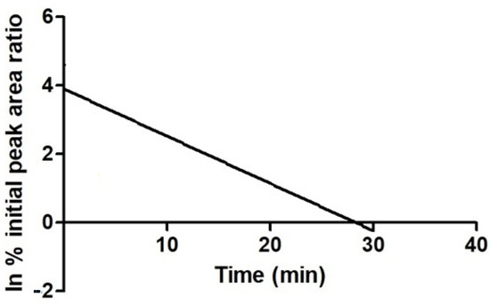 Approximately 5% of the parent compound JH3 remained at the 15 min time point, resulting in an in vitro half time (t1/2) of 5 min and intrinsic clearance (Clint) of 172 µL/mg min. A plot demonstrating the depletion of JH3 in HLMs is given in Figure 7. For JH10, less than 0.5% of this compound was detected at the 5 min time point. Due to the limited number of time points in this region, the t1/2 of JH10 could not be calculated accurately, however, it can be stated that its t1/2 was lower than 5 min and its Clint was higher than that of JH3 (Table 5).