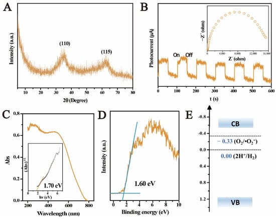 Physicochemical properties of ferrihydrite, XRD pattern (A), time-dependent photocurrent measurement and EIS (inset) (B), UV–Vis diffuse reflectance spectra (C) and the optical band gap energy (inset), valence band X-ray photoelectron spectroscopy (VB-XPS) (D), and the band edge positions (E).