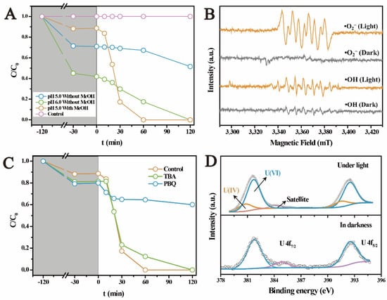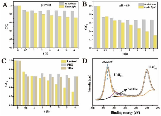 The photocatalysis of U(VI) by ferrihydrite in open air at pH 5.0 (A) and 6.0 (B), free radicals capture experiments under aerobic conditions (C), and U 4f spectrum of the obtained products for the photocatalysis of U(VI) in air (D).