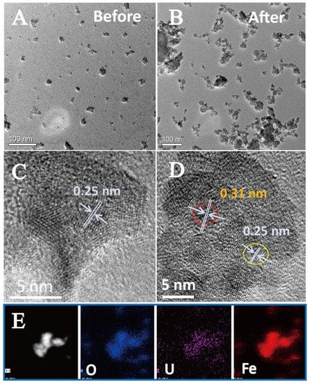 The transformation of U(VI) on ferrihydrite during the photocatalytic process was further determined by XPS investigation. Figure 2D compares the U 4f spectra of the uranium loaded ferrihydrite before and after light irradiation. In darkness, two peaks appeared at 381.9 eV and 392.9 eV, corresponding to the characteristics of U(VI) adsorbed on ferrihydrite [34]. After irradiating the sample by light, U 4f5/2 and U 4f7/2 peaks shifted by ~0.4 eV to lower binding energy, both of which could be deconvoluted into two peaks, respectively. Comparing with the results of U(VI) adsorbed on ferrihydrite, new peaks appeared at 380.8 eV and 391.6 eV, corresponding to the characteristics of U(IV) [34]. This result confirmed the reduction of U(VI) on light-irradiated ferrihydrite. However, XPS analysis also indicated that uranium partially existed in its hexa-valence in the products after the photocatalytic reactions. This phenomenon was similar to all studies involving the photocatalytic U(VI) reduction [27,28,29,30,31,32,33,34]. It was considered that the products were UO2+x (x < 0.25) [40,41,42], or the reduced products was re-oxidized again on the surface [34]. Figure 3A shows the morphology of raw ferrihydrite. Pristine ferrihydrite formed relatively uniform aggregates with diameter of about 20 nm. Comparing with the small aggregates of raw ferrihydrite, the size of aggregates became much bigger after the photocatalytic reactions (Figure 3B). The HRTEM image of raw ferrihydrite showed that the space of the lattice fringe was about 0.25 nm (Figure 3C), corresponding to the (110) plane of ferrihydrite [43]. Upon light illumination, additional fringes with a spacing of 0.31 nm were observed (Figure 3D), which is in accord with the characteristic of the (111) facet of UO2+x [33,40]. The formation of the uranium-containing deposits on ferrihydrite surface could be further verified by the elemental mapping (Figure 3E), where uranium uniformly deposited on ferrihydrite surface. The above results proved that U(VI) was photocatalytically reduced by ferrihydrite, forming uranium oxides with crystal structures similar to UO2. In summary, it was proved that light irradiated ferrihydrite could induce photocatalytic reactions under anaerobic conditions, reducing U(VI) to insoluble U(IV) deposits, which subsequently changed the behaviors and fate of uranium in nature. This may help to better understand the environmental behaviors of uranium in anerobic environment, such as subsurface waters containing semiconductor minerals.