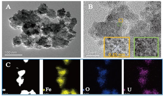 TEM images of ferrihydrite after the photocatalysis of U(VI) in air (A,B), and the corresponding element distribution (C).