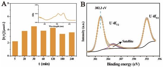 Actually, this has become one of the traditional processes for producing the so-called ‘yellowcake’. To verify this, the generation of H2O2 on ferrihydrite was detected by adding N,N-diethyl-p-phenylenediamine (DPD) to the sample after light irradiation [48]. As shown in Figure 6A, the generation of H2O2 was verified by the characteristic red color of DPD•+ and strong absorbance at ~550 nm in the UV–vis absorbance spectrum (inset in Figure 6A). The concentration of H2O2 remained at about 3.5 × 10−6 mol/L. The critical role of H2O2 in the photocatalytic removal of U(VI) under aerobic conditions was also supported by the results of the radical capture experiments. The suppressing of •O2− and •OH radicals restrained the generation of H2O2, and subsequently made the removal of U(VI) hardly occurred. Furthermore, the XPS spectra of UO4•xH2O standard was obtained and shown in Figure 6B. The binding energy of UO4•xH2O standard located at 382.3 eV (U 4f7/2) and 391.1 eV (U 4f5/2), respectively, which were the same with the photocatalysis products of U(VI) obtained in air atmosphere. This also supported the formation of UO4•xH2O deposits on ferrihydrite under aerobic conditions. In general, it was proved that the irradiation of light on ferrihydrite under the aerobic conditions led to the generation of H2O2, which subsequently resulted in the precipitation of uranyl, in the form of UO4•xH2O (s).