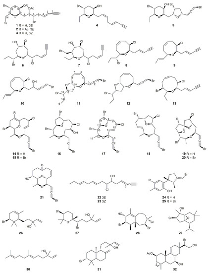 Chemical structures of compounds 1–32 isolated from the red algae Laurencia microcladia (1–7, 11–12, 24–27, and 29–32) and Laurencia obtusa (7–10, 13–25, and 28).