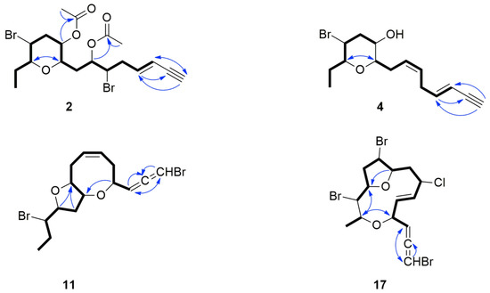 COSY (bold bonds) and important HMBC (arrows) correlations observed for compounds 2, 4, 11 and 17.
