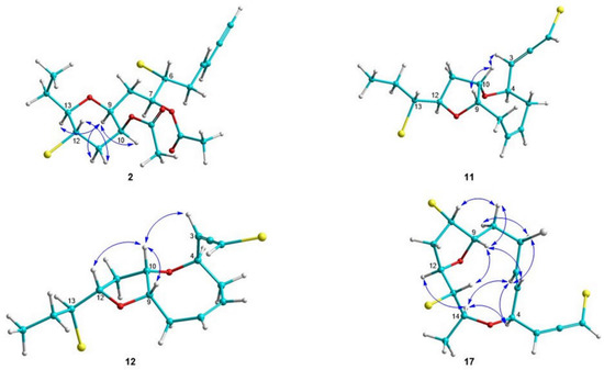 Key NOE correlations observed for compounds 2, 11, 12 and 17.