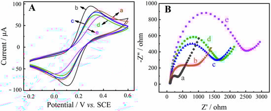 Cyclic voltammogram (CV) and electrochemical impedance spectroscope (EIS) techniques were used to characterize each step of the CAP aptasensor fabrication procedure. The CV curves for different steps of modified electrodes were recorded in [Fe (CN)6]3−/4− redox probe solution. As shown in Figure 2A, the bare GCE electrode (curve a) exhibited a well-defined pair of reversible redox peaks. Compared with bare GCE, the reversible redox peak current increased markedly, and the peak potential separation (ΔEp) decreased after immobilization of MXene–AuNPs (curve b). This can be attributed to the composite of MXene–AuNPs, which can effectively increase the conductivity of the electrode and facilitate electron transfer. After Apt was incubated on the MXene–AuNP/GCE surface, the redox peak current dropped dramatically, indicating that the negatively charged phosphate backbone of the aptamer exerted strong electrostatic repulsion forces to [Fe(CN)6]3−/4− (curve c) [28]. After treatment with MCH, a further decrease was observed in peak current due to the insulating property of MCH (curve d). Finally, when the CAP target was added, CAP specifically bonded with Apt and led to a further decrease in CV response (curve e). This could be attributed to the fact that the specific binding of CAP and Apt causes a configuration change of Apt to impede the charge transfer process. As a result, all observations of CV showed that the Apt/MXene–AuNP/GCE was successfully constructed.