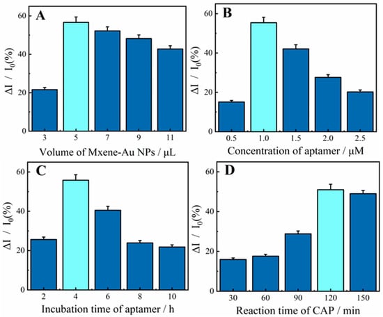 Conditions optimization results for the aptasensor. (A) The volume of MXene–AuNPs. (B) The concentration of Apt. (C) Incubation time of Apt. (D) Reaction time between CAP and Apt.