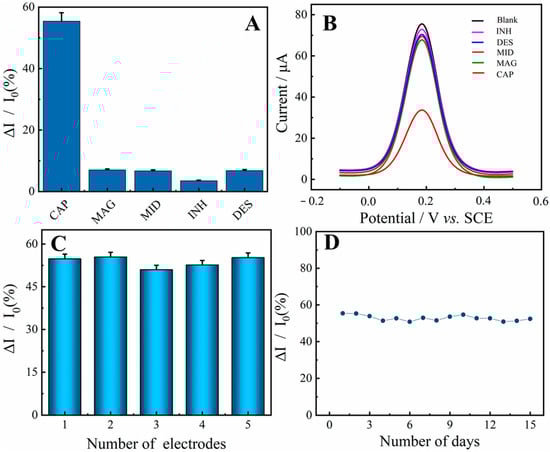 (A) The inhibition ratio of the aptasensor in the presence of 1 nM CAP or 50 nM interferences (MAG, MID, INH and DES), (B) DPV response of the aptasensor in the presence of 1 nM CAP or 50 nM interferences (MAG, MID, INH and DES), (C) Reproducibility of the aptasensor, (D) Stability of the aptasensor.
