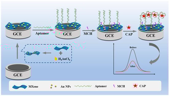 Based on the above, we developed a simple and label-free electrochemical aptasensor based on AuNP-modified MXene sheets, which can implement efficient and sensitive detection of CAP. AuNPs grew well on the surface and between the layers of MXene through a self-reduction process without reducing agent or stabilizer. As a promising sensing platform, the composite of MXene–AuNPs possesses a high specific surface area, abundance of exposed active sites, and outstanding electronic conductivity. The Apt with 5′-end modified sulfhydryl was incubated on the surface of a MXene–AuNP-modified electrode by Au–S bond. When CAP was added, CAP–Apt complexes produced with poor conductivity on the surface of sensor increased the impediment of electron transfer, causing a decrease in electrochemical signal. The designed electrochemical aptasensor for CAP detection presents a wide linear range and a low detection limit. In addition, the aptasensor displays considerable potential in practical sample analysis with excellent recovery.